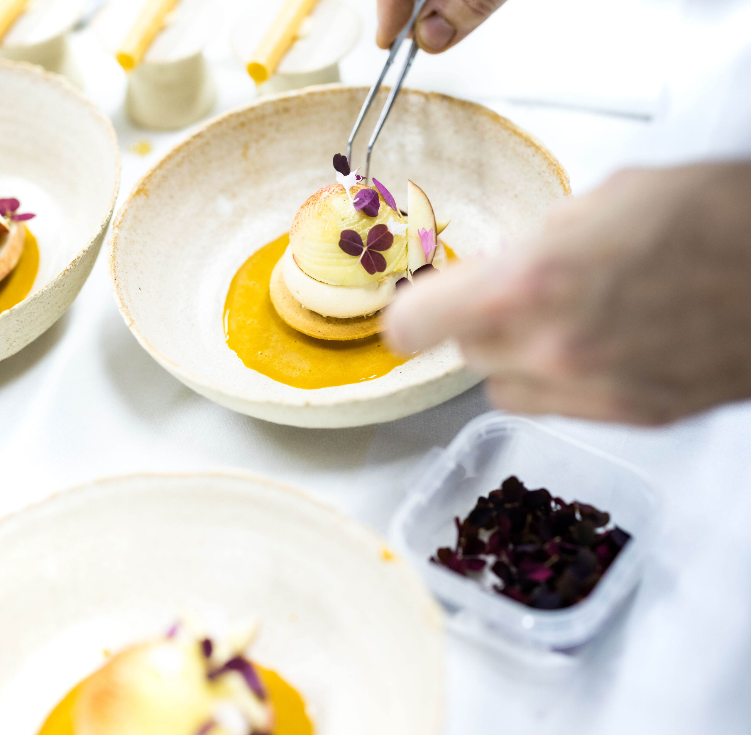 Bereits um 9 Uhr herrschte in der Showküche der Hotelfachschule Zürich Hochbetrieb. Ab 9.15 Uhr traten im Viertelstundentakt die Finalistinnen und Finalisten der Kategorien Küche und Pâtisserie an. Zwei Stunden hatten sie Zeit, um sowohl das Gericht, mit dem sie sich qualifiziert hatten, als auch eine spontane Kreation mit Zutaten aus dem Mystery‑Warenkorb, zuzubereiten.