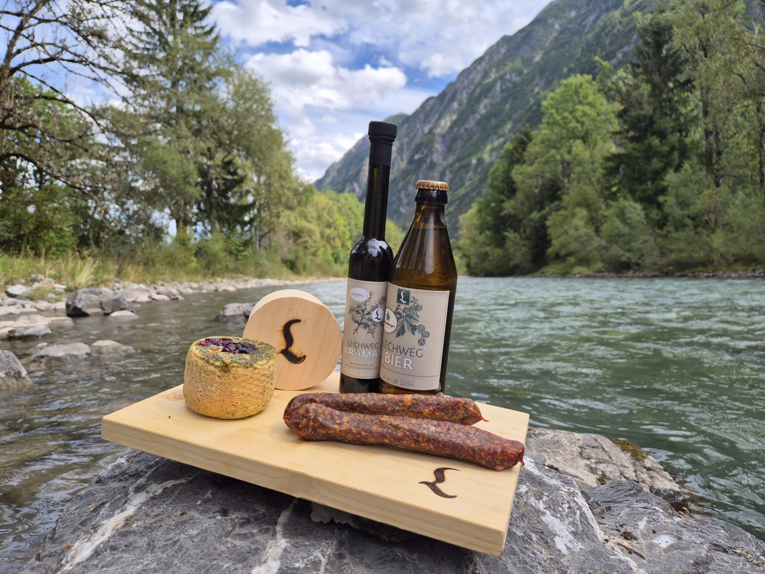 Wer den gesamten Lechweg absolviert, sollte die verdienten Pausen zwischen den einzelnen Tagesetappen nicht nur zum Schlafen und Relaxen nutzen. Denn auf den 125 Kilometern von der Quelle am Vorarlberger Formarinsee bis zum Lechfall im Allgäu warten regionale Erzeuger mit verschiedensten kulinarischen Genüssen auf – und freuen sich über Besucher: Die Auswahl reicht von den Gehrnerhof-Kaminwurzen aus Warth am Arlberg über den Lechweg-Gin vom Lechtaler Haussegen in Elbigenalp und den feinen Käse „Beeriger Lechtler“ von der Naturkäserei Soier in Steeg bis hin zum Lechlüfterl aus den edelsten Stücken der Rinder des Gorihofs in Reutte. Und wenn‘s mal kalt werden sollte, hilft der Lechweg-Tee mit Selbstgesammeltem von den Lechtaler Kräuterhexen. Allen Lechweg-Produkten gemein ist der Lokalkolorit des Landstrichs zwischen Österreich und Deutschland, der die fünf Regionen Lech am Arlberg, Warth am Arlberg, Tiroler Lechtal, Reutte/Tirol und schliesslich das bayerische Füssen durch einen der letzten Wildflüsse Europas und die grenzüberschreitende Weitwanderung verbindet.
