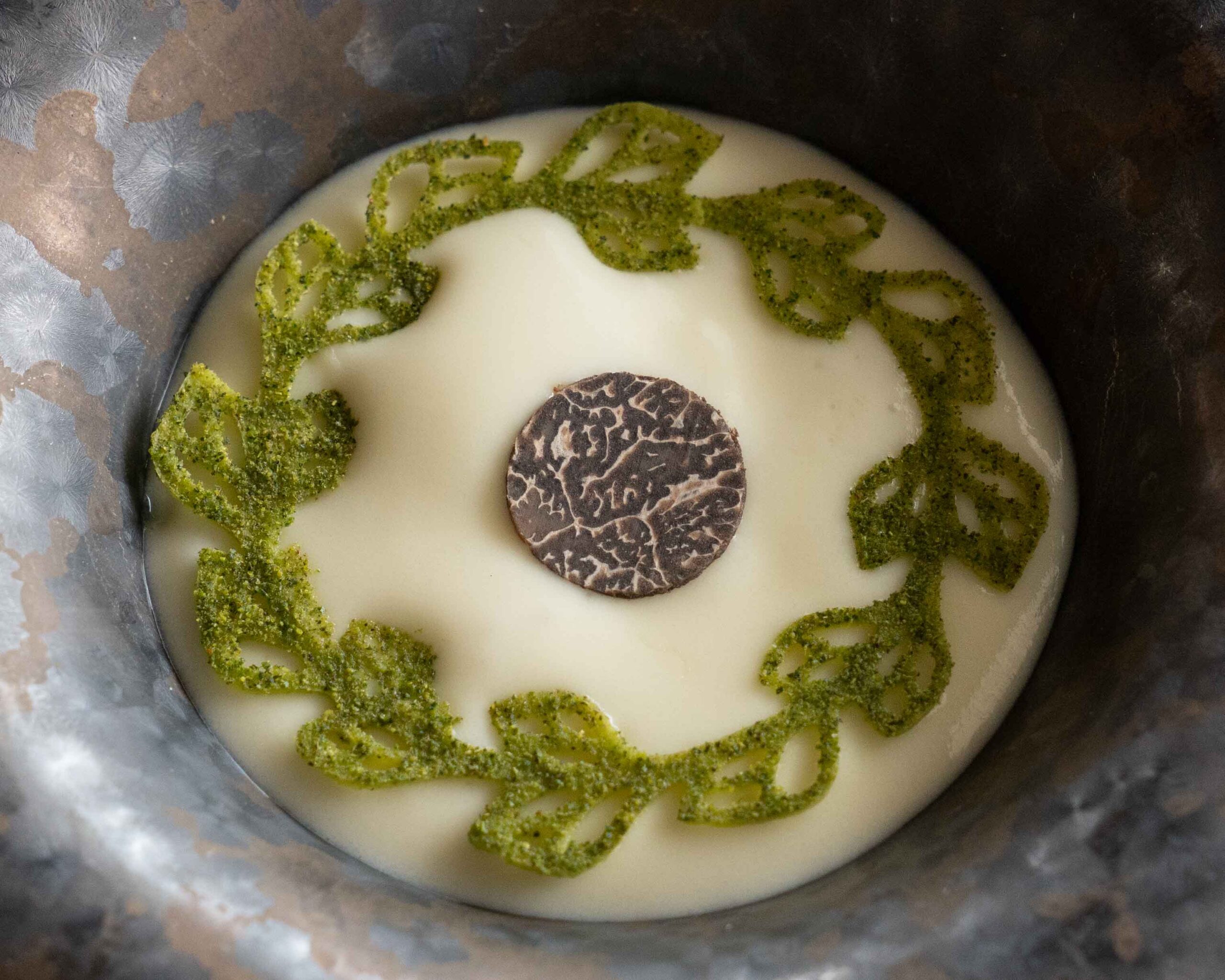 Auf dem Teller zeigt sich dies als moderne Interpretation mit tiefem Respekt für kulinarische Traditionen und handwerkliches Erbe. Als ehemaliger Gewinner des Ethical Cuisine Trophy von Relais & Châteaux spielt Nachhaltigkeit eine zentrale Rolle. So bietet das Degustationsmenü auch eine rein pflanzliche Variante, treffend benannt als „Ethical Vegan Cuisine“.
